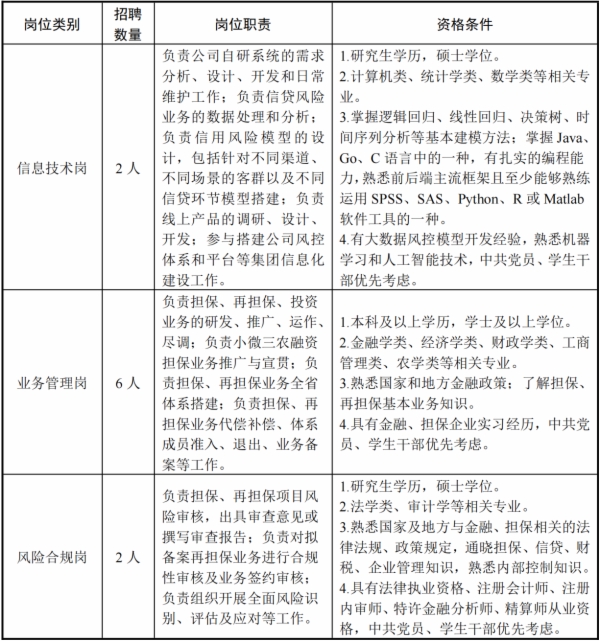 山东投融资担保集团拟招聘信息技术岗、业务管理岗、风险合规岗共10人,其中,信息技术岗2人、业务管理岗6人、风险合规岗2人。本次招聘主要面向计算机类、统计学类、数学类、金融学类、经济学类、财政学类、法学类、工商管理类、农学类等相关专业本科及以上学历应届毕业生。