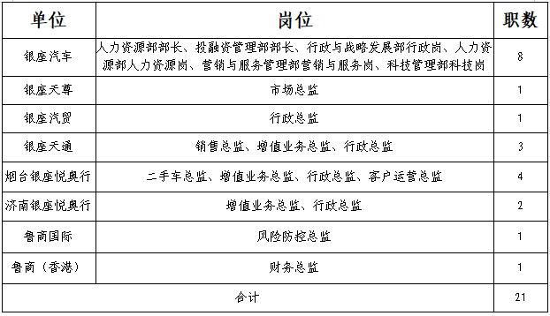 公司总部各部室岗位8人、直属单位管理层岗位13人。岗位职责和任职资格详见附件1。条件特别优秀者可适当放宽要求。