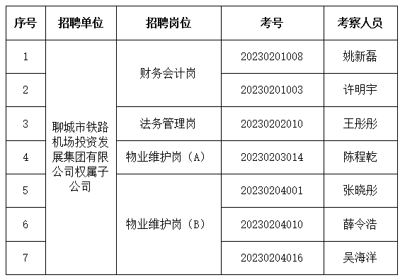 根据招聘公告的有关规定,经过笔试、面试等招聘程序,现将聊城市铁路机场投资发展集团有限公司2023年“水城优才”招聘进入考察范围的人员名单公示如下: